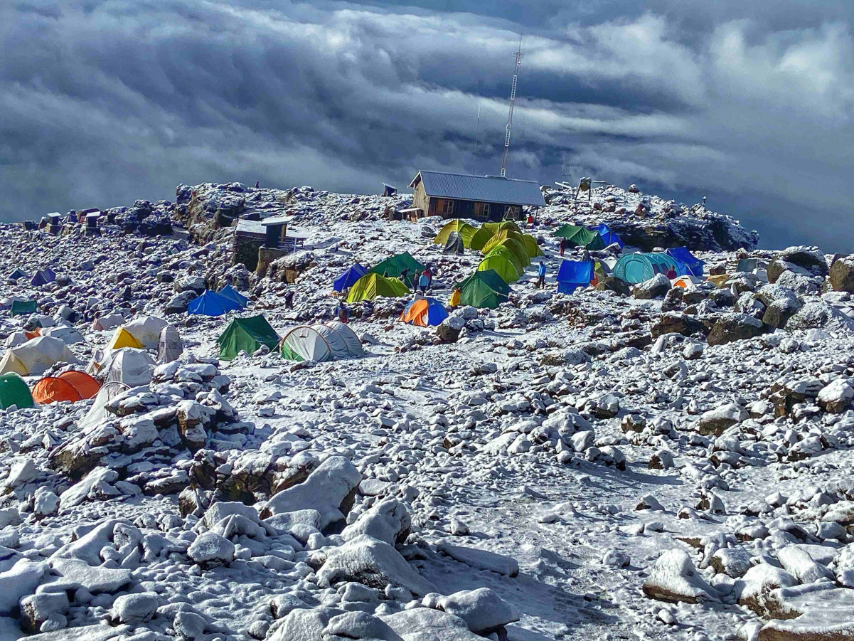 We climb gradually, then cross the lunar desert of the “Saddle” between Mawenzi and Kibo. Our camp, Kibo Hut, sits at the bottom of the Kibo crater wall. Once here we rest, enjoy an early dinner to prepare for the summit day.
